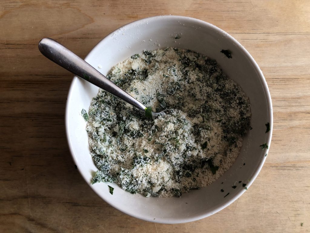 • In einem Schälchen zwei Esslöffel geriebenen Käse mit zwei Esslöffeln Semmelbrösel mischen und die gehackte Knoblauch-Petersilien-Mischung hinzufügen.