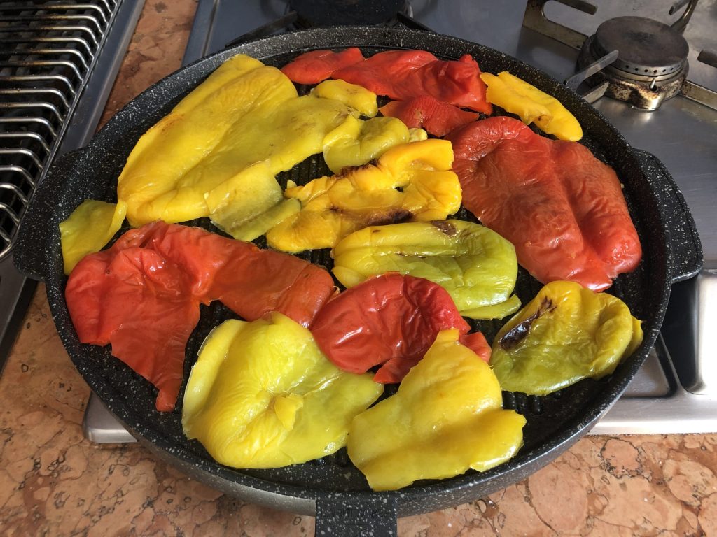 • Die Paprika waschen, in Streifen schneiden, alle inneren Fäden und Samen entfernen und auf einer leicht geölten geriffelten Gusseisenpfanne grillen, bis sie weich sind. Wenn ihr möchtet, könnt ihr sie auch im Ganzen im Ofen garen. Sobald sie geröstet sind, in einem Beutel ruhen lassen, bevor ihr sie schält und in Streifen schneidet.
