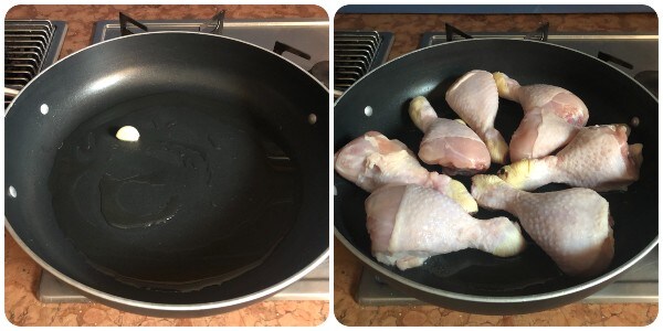 In einer großen Pfanne ein paar Esslöffel Öl zusammen mit einer ganzen Knoblauchzehe erhitzen, bevor die Hähnchenschenkel hinzugefügt werden.