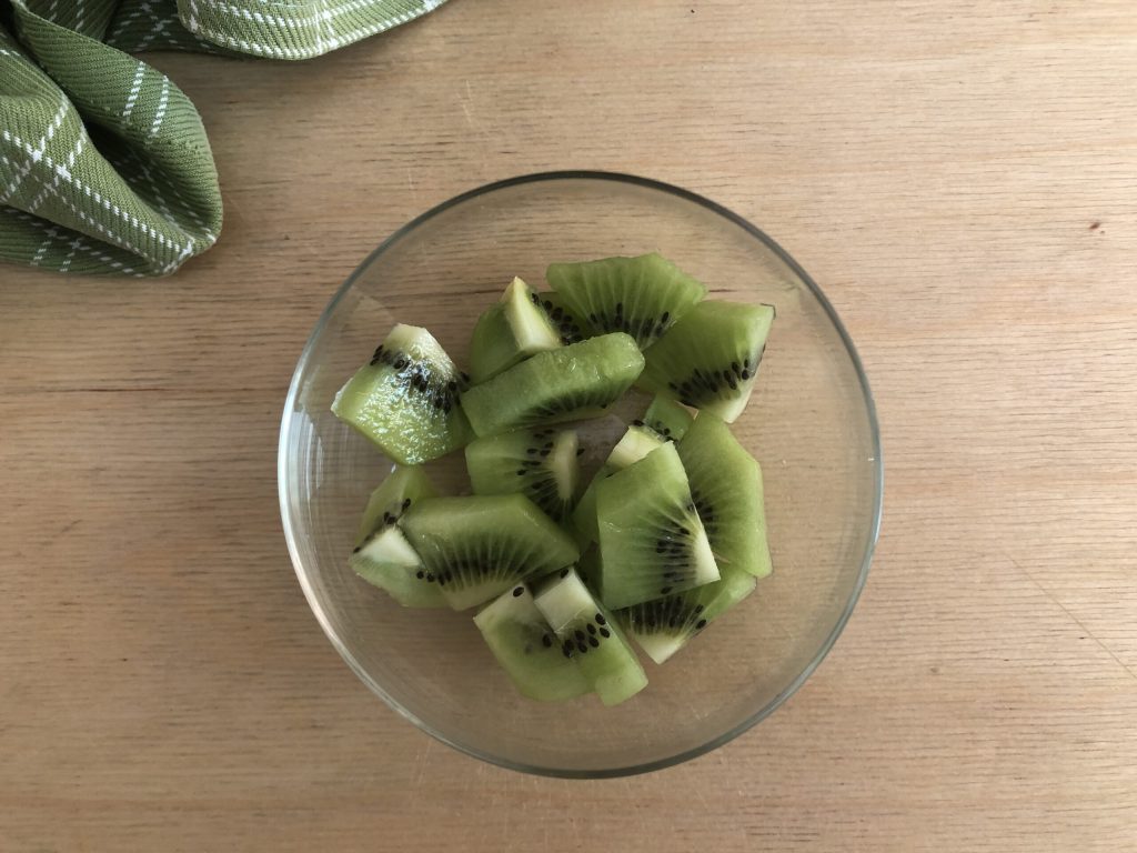 Schälen Sie die Kiwi, schneiden Sie sie in Scheiben und legen Sie diese auf den Boden eines Einzelportionenbechers (heben Sie einige für die endgültige Dekoration auf).