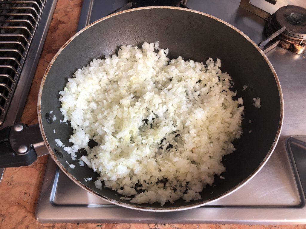 In einer Pfanne zwei Esslöffel Öl erhitzen, die Zwiebeln hinzufügen, mit einer Prise Salz würzen und bei niedriger Hitze 7/8 Minuten unter häufigem Rühren dünsten.