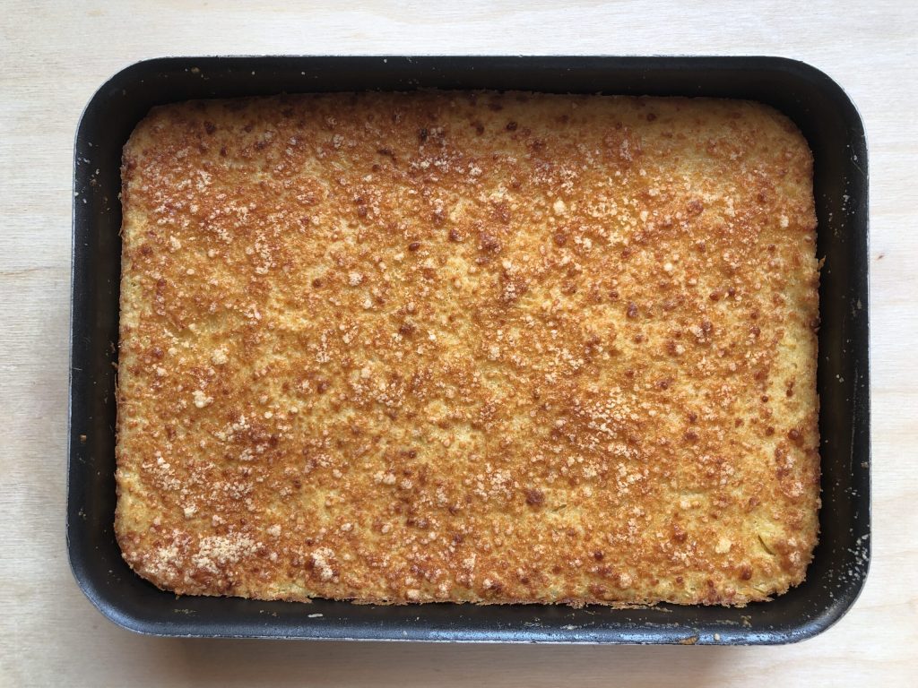 Abschließend den Teig in eine zuvor gebutterte rechteckige Backform geben und mit einem Spatel auf eine Höhe von 2/3 cm glattstreichen.