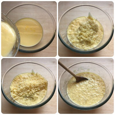 Die abgekühlte geschmolzene Butter, die abgekühlten Zwiebeln und den geriebenen Emmentaler zur Ei-Milch-Mischung geben und alles gut vermengen.