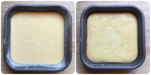 Die erhaltene Mischung (Dicke von ½ cm bis etwa 1 cm) in eine zuvor gebutterte und bemehlte Form gießen: Wenn Sie die volle Menge für 6/8 Personen zubereitet haben, ist die ideale Größe 30 x 20 cm. Wenn Sie die Mengen halbiert haben, ist eine kleine quadratische Form von 20 cm perfekt.