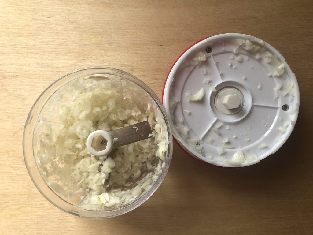 Die Zwiebel schälen und fein hacken. Ich habe einen super praktischen manuellen Seilhacker verwendet. Wenn ihr ihn kaufen möchtet, könnt ihr ihn HIER finden.