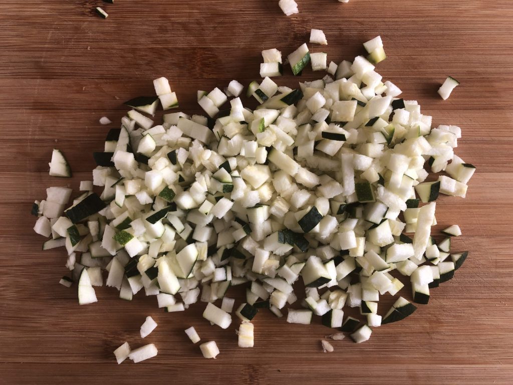 Die Zucchini abschneiden, waschen und in Würfel schneiden.