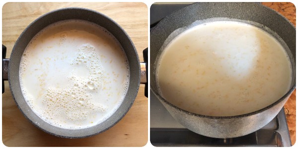 • Die Milch in einen Kochtopf gießen, den Zucker und die Schale einer halben Zitrone hinzufügen und umrühren.