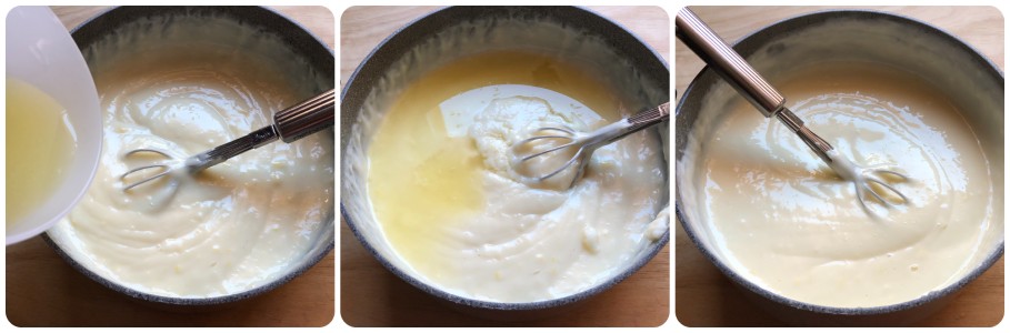 • In der Zwischenzeit die Eier in eine Schüssel schlagen, den Puderzucker und die Maisstärke hinzufügen und mit einem kleinen Schneebesen zu einer homogenen Creme verrühren.