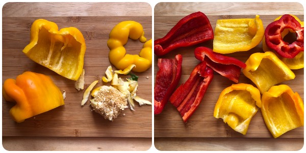 • Die Paprikaschoten reinigen, indem man den Stiel und alle Samen sowie die weißen inneren Adern entfernt. Waschen und mit Küchenpapier abtupfen.
