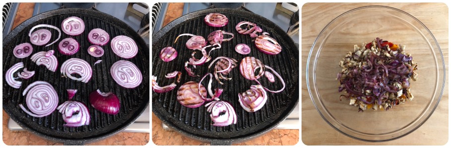 • Die Zwiebel schälen, in Ringe schneiden und ebenfalls grillen. Dann die Ringe zum restlichen Gemüse geben.