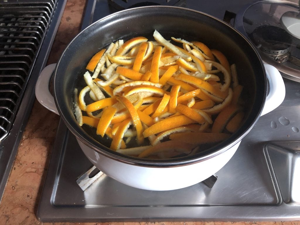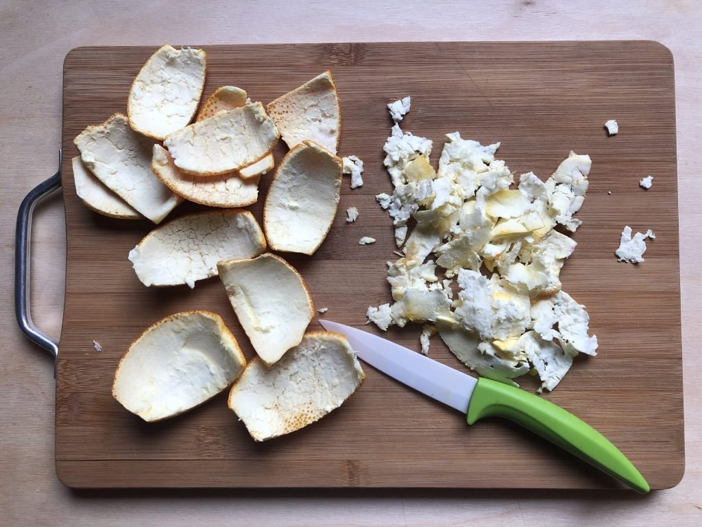 Mit einem kleinen Messer den überschüssigen weißen Teil von den Schalen entfernen. Ich empfehle dringend, nur biologisch unbehandelte Orangen zu verwenden, da die Schale der anderen nicht essbar ist.