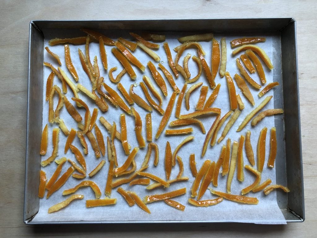 Dann den Herd ausschalten und die Orangenschalen auf ein mit Backpapier ausgelegtes Backblech (oder Tablett) legen, sodass sie nicht aneinander kleben.