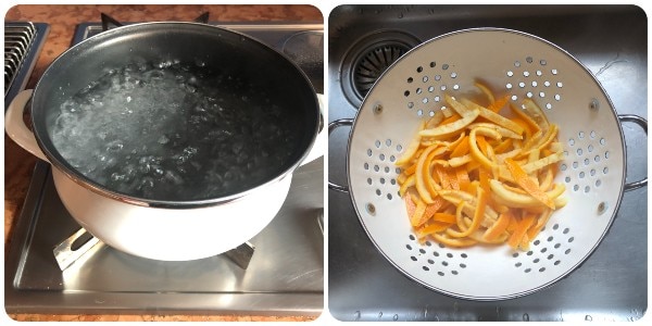 Die Schalen abgießen, erneut Wasser im Topf zum Kochen bringen und denselben Vorgang wiederholen, wobei die Schalen weitere drei Minuten gekocht werden. Auf diese Weise verlieren sie vollständig ihren bitteren Geschmack.