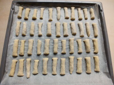Den Teig noch etwas weiterarbeiten, dann kleine Mengen abnehmen und auf einer bemehlten Arbeitsfläche kleine Röllchen formen. Jedes Röllchen in Stücke von 6/7 cm Länge schneiden.