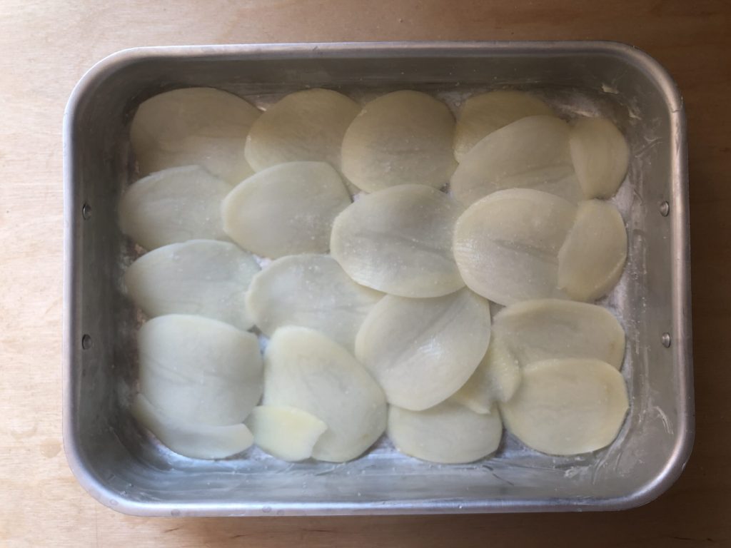 • Den Boden und die Ränder einer Auflaufform mit Butter einfetten und eine erste Schicht mit den Kartoffelscheiben bilden. Nach Belieben salzen.