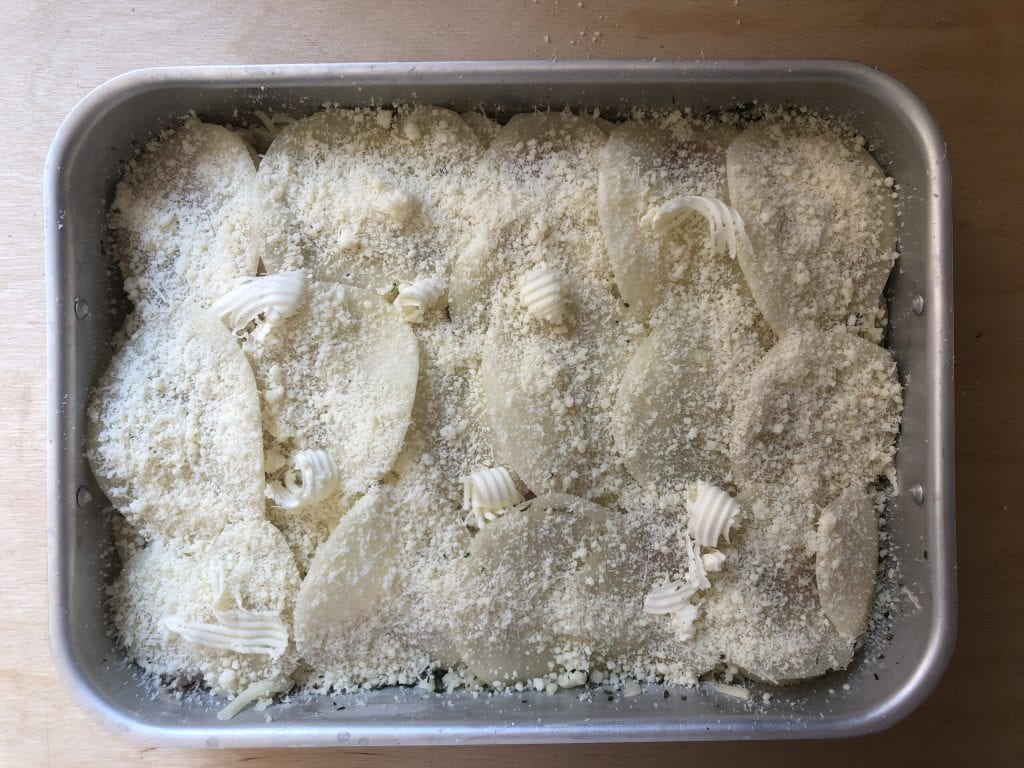 • Diese Reihenfolge (Kartoffeln, Salz, Kräutermischung, Scamorza und gekochter Schinken) wiederholen, bis die Zutaten aufgebraucht sind, und mit einer Schicht Kartoffeln abschließen.