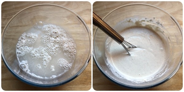 Das Weizenmehl in eine Schüssel geben, Wasser hinzufügen und mit einem kleinen Schneebesen rühren, bis ein glatter, klumpenfreier Teig entsteht.