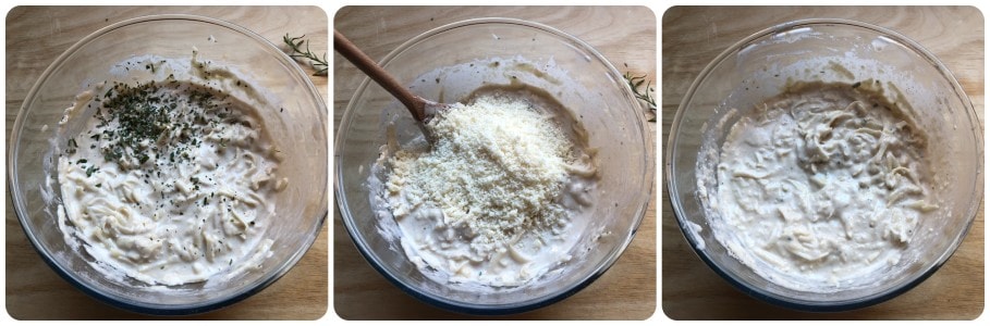 Zum Schluss mit gehacktem Rosmarin würzen und den geriebenen Käse hinzufügen. Alle Zutaten perfekt vermischen.