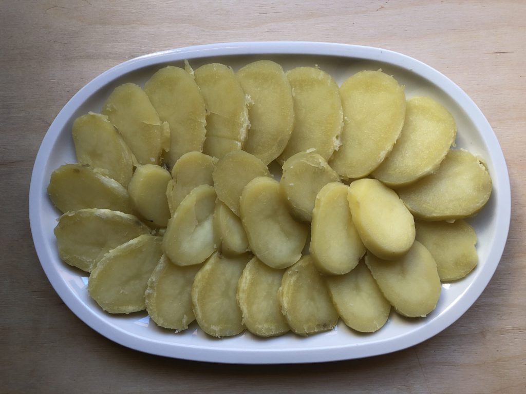 • Wenn sie gekocht sind, schälen und in Scheiben von etwa 4/5 mm Dicke schneiden.