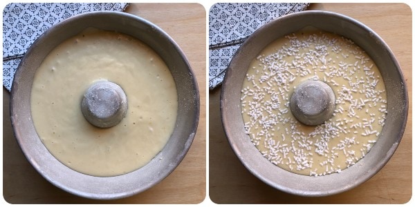 Den fertigen Teig in eine Gugelhupfform mit einem Durchmesser von 24 cm gießen, die zuvor gebuttert und bemehlt wurde, und die Zuckerstreusel gleichmäßig auf der Oberfläche verteilen.