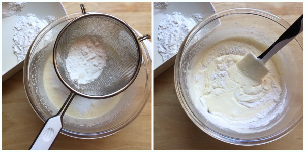 Das Reismehl mit dem Kartoffelstärke durch ein feines Sieb sieben und mit einem Spatel perfekt einarbeiten.