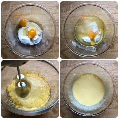 • Den Ricotta in eine Schüssel geben, die Eier, den Zucker und das Öl hinzufügen und alles mit den elektrischen Rührbesen verrühren. Eigentlich können Sie auch einfach einen Spatel verwenden, wenn Sie möchten.