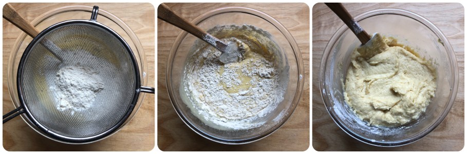 • Anschließend das Mehl nach und nach hinzufügen, indem Sie es durch ein Sieb mit feinen Maschen sieben.