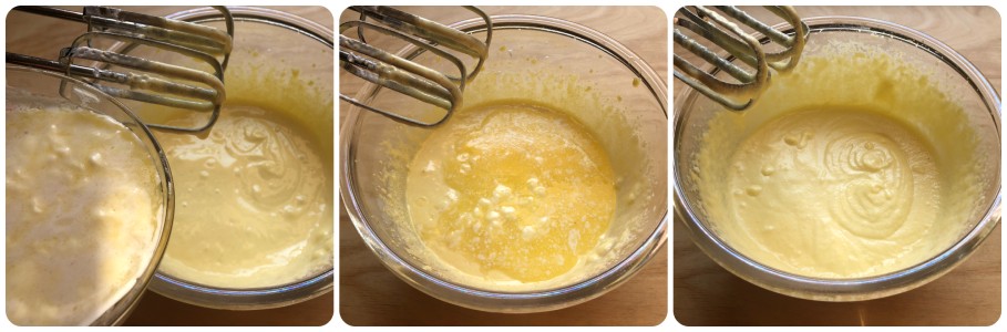 Auch die inzwischen abgekühlte Butter hinzufügen und die Masse erneut mit dem Mixer bearbeiten.
