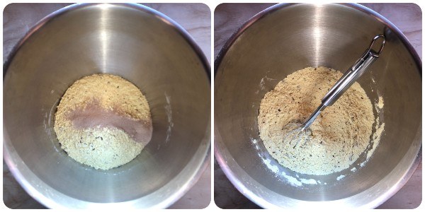 • Mehl in die Schüssel der Küchenmaschine geben, Hefe hinzufügen und mit einem kleinen Handbesen mischen.