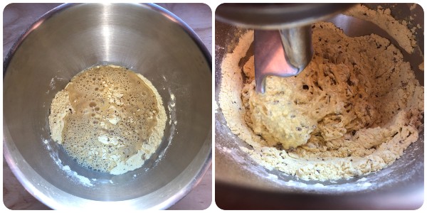 • Dann das lauwarme Wasser und den Honig hinzufügen und mit dem Knethaken zu kneten beginnen.