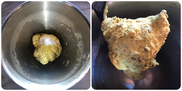 • Wenn der Teig etwas kompakter geworden ist und das Mehl das Wasser aufgenommen hat, Öl und Salz hinzufügen und weiter kneten, bis der Teig sich am Haken hochzieht.