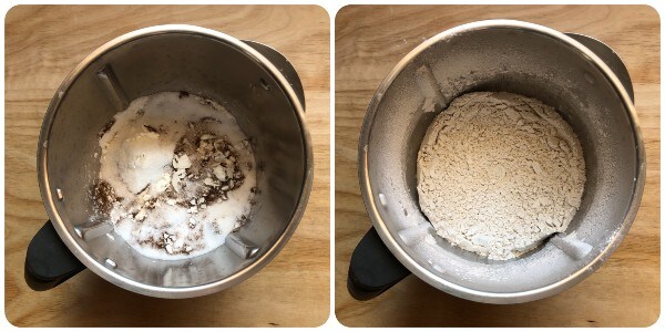 Alle trockenen Zutaten in einen Mixer geben (Mehl, Kartoffelstärke, Lakritzpulver, Zucker, Backpulver, Prise Salz) und kurz mischen. Mit dem Thermomix, 15 Sekunden auf Stufe 4.