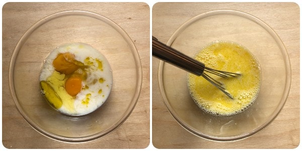 Die Eier in eine zweite Schüssel aufschlagen, einen Esslöffel Öl (6 ml) und die Milch hinzufügen und mit einem kleinen Schneebesen vermischen.