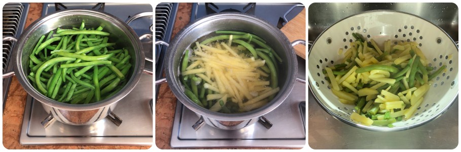 Nach 10 Minuten auch die Kartoffeln hinzufügen und die Garzeit für weitere 5 Minuten fortsetzen, bevor alles abgeseiht wird.