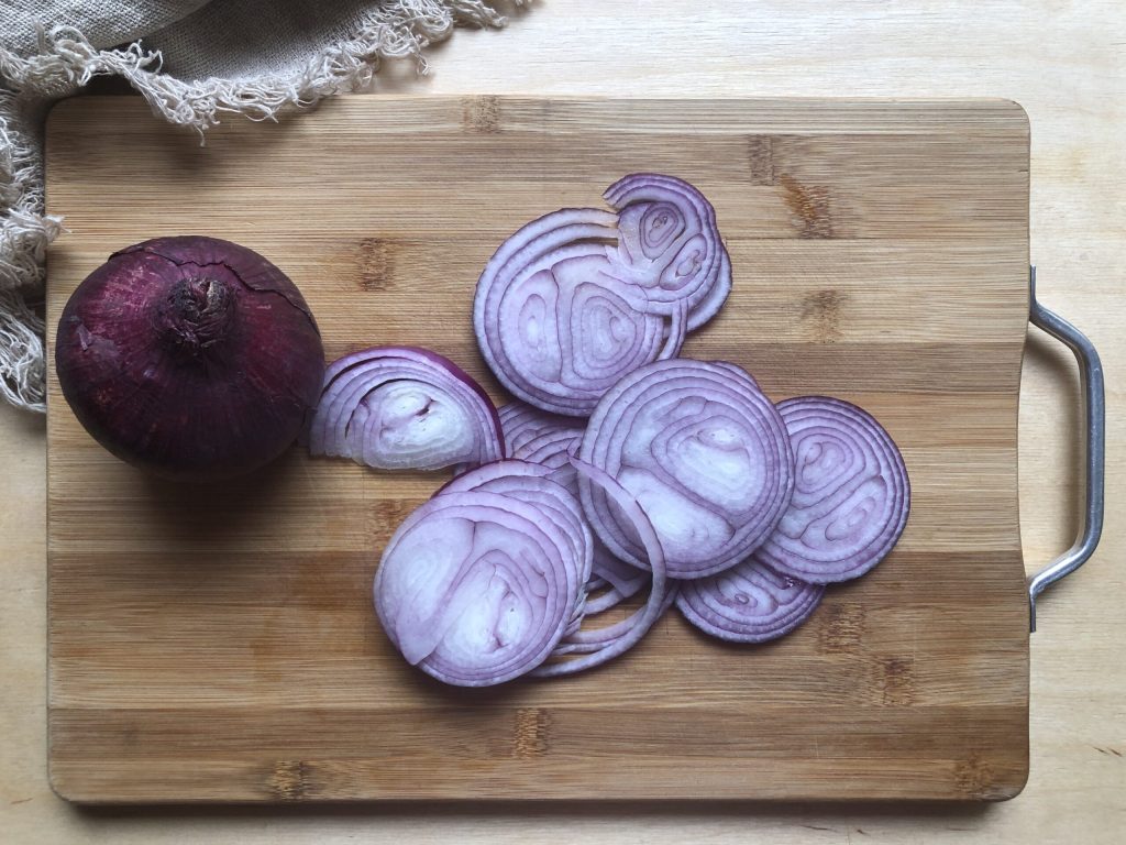 Die Zwiebel schälen, waschen und mit einem Messer in Ringe schneiden. Verwenden Sie nicht die Mandoline, da Sie sonst zu dünne Scheiben erhalten.