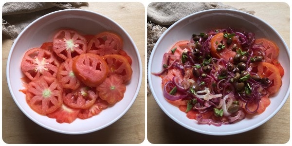 In eine Salatschüssel geben, die marinierten Zwiebelringe hinzufügen, mit den Händen zerrissene Basilikumblätter, Kapern und Taggiasca-Oliven nach Belieben hinzufügen. Eine halbe Stunde ruhen lassen, damit sie gut durchziehen.