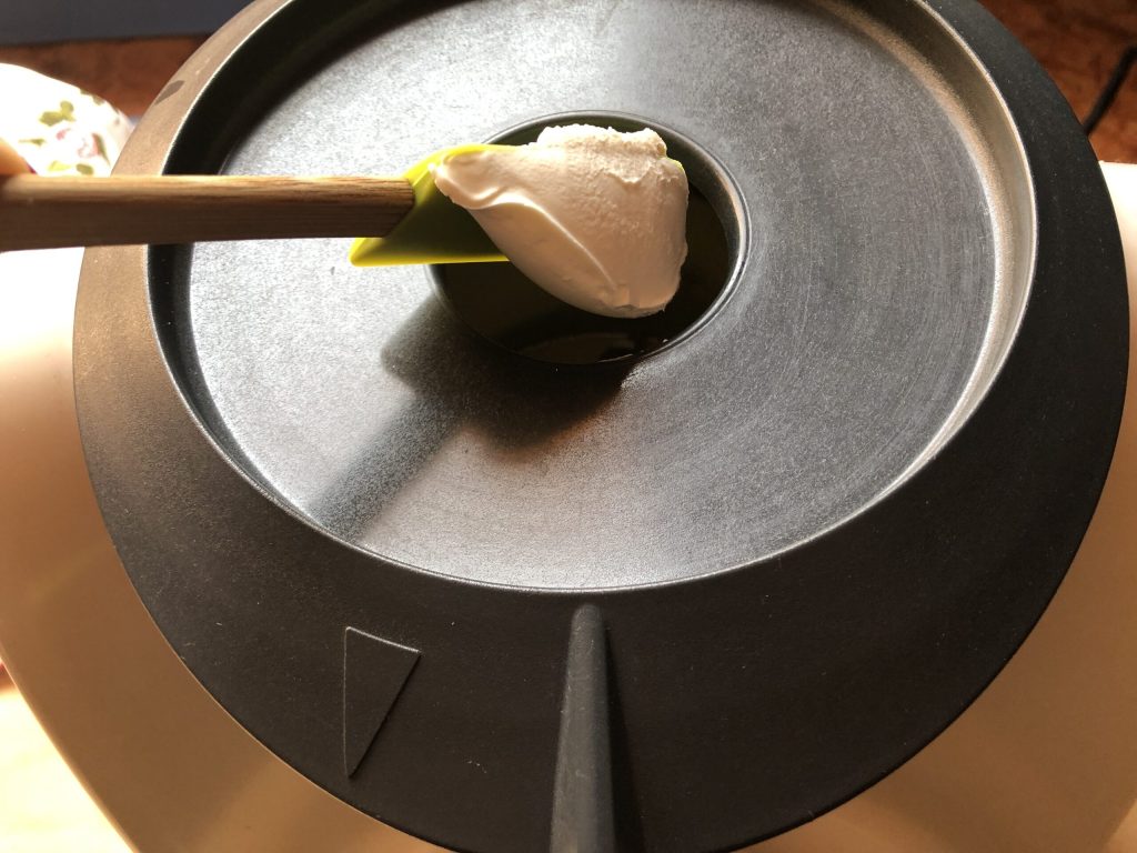 Jetzt den Schmetterling entfernen, den Mixtopf schließen und bei laufenden Messern auf Stufe 1,5 den kalten Mascarpone aus dem Kühlschrank löffelweise durch die Öffnung zuführen.