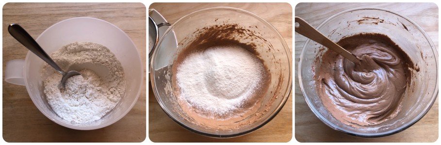 Mehl mit Backpulver mischen, dann nach und nach in die Schüssel sieben und mit einem Spatel unterheben.