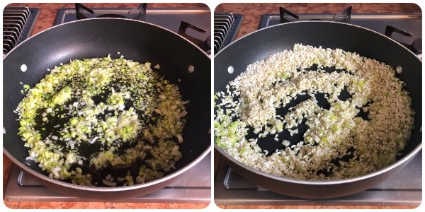 • In einem Topf einige Esslöffel Öl erhitzen, bevor der Lauch hinzugefügt wird. Für einen Moment brutzeln lassen, dann den Reis hinzufügen und für ein paar Minuten unter ständigem Rühren rösten, damit die Röstung gleichmäßig wird.