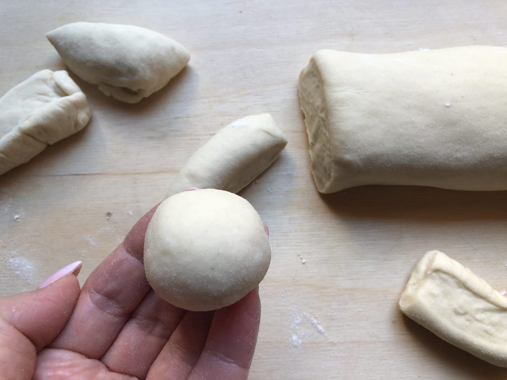 Nach der Gehzeit den Teig auf die Arbeitsfläche geben, einen Strang formen und etwa 30 g schwere Stücke schneiden.
