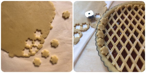Kneten Sie die Teigreste erneut und formen Sie kleine Figuren nach Belieben (ich habe kleine Blumen gemacht), die Sie am Rand der Torte platzieren können, um die Schnitte des Gitters zu verdecken. Ich habe einige auch auf die Oberfläche gelegt.