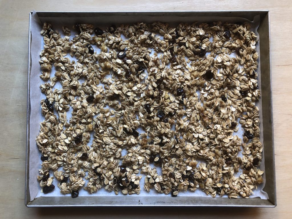 Zum Schluss das Müsli mit Zimt auf einem mit Backpapier ausgelegten Backblech verteilen.