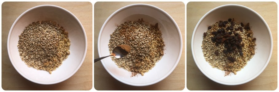 Sonnenblumenkerne, Zimtpulver und die Rosinen hinzufügen. Den Zimt können Sie nach Belieben dosieren.