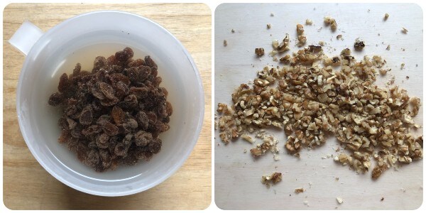 Rosinen leicht in warmem Wasser einweichen, dann abtropfen lassen, ausdrücken und mit Küchenpapier abtupfen. Die Walnüsse grob mit einem Messer zerkleinern.
