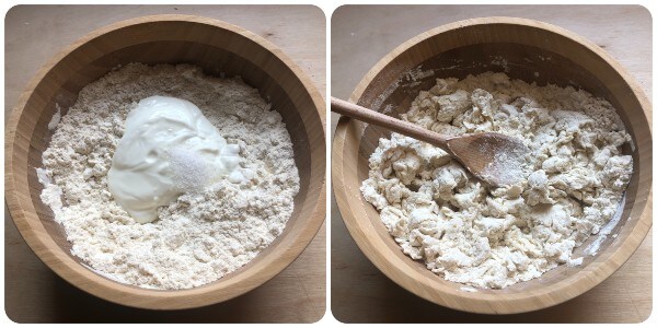 Den Joghurt und das Salz hinzufügen und mit einem Holzlöffel in der Schüssel vermengen.
