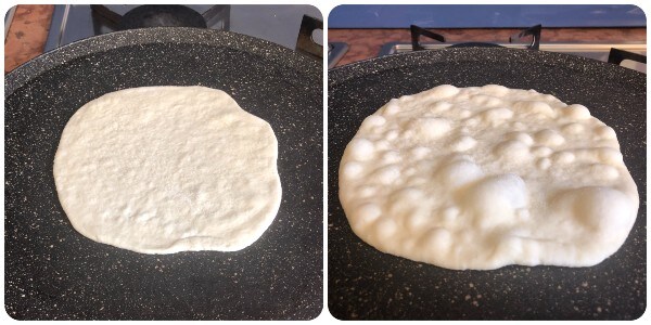 Eine Gusseisenplatte sehr gut erhitzen (oder auch eine Antihaftpfanne), das Naan-Brot darauflegen und für ein paar Minuten backen. Sie werden sehen, dass sich Blasen bilden.