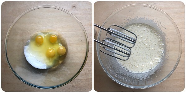 In einer großen Schüssel Zucker und Eier geben und mit den elektrischen Schneebesen lange schlagen, bis die Masse hell und schaumig ist