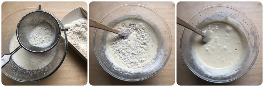 Nun beginnen, das Mehl allmählich durch ein feinmaschiges Sieb zu sieben und mit einem Spatel in die Masse einarbeiten.