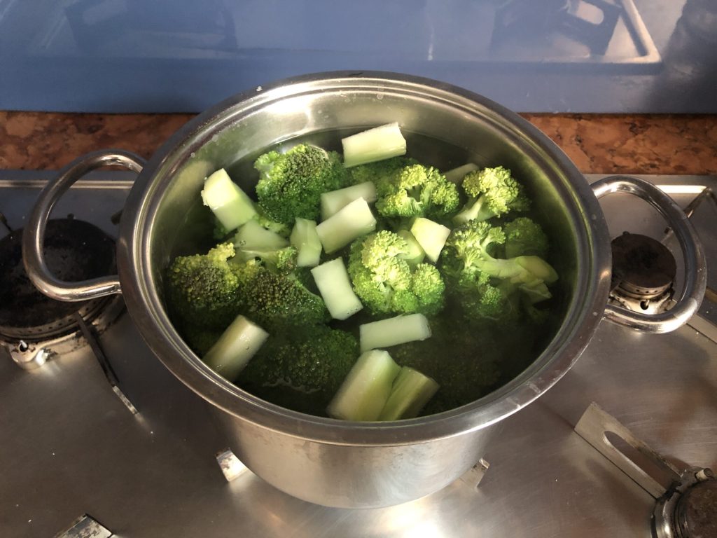 • In einem Topf reichlich gesalzenes Wasser zum Kochen bringen. Röschen und Stiel zugeben und 5 Minuten ab dem Wiederaufkochen garen. Sie sollten sehr weich sein.