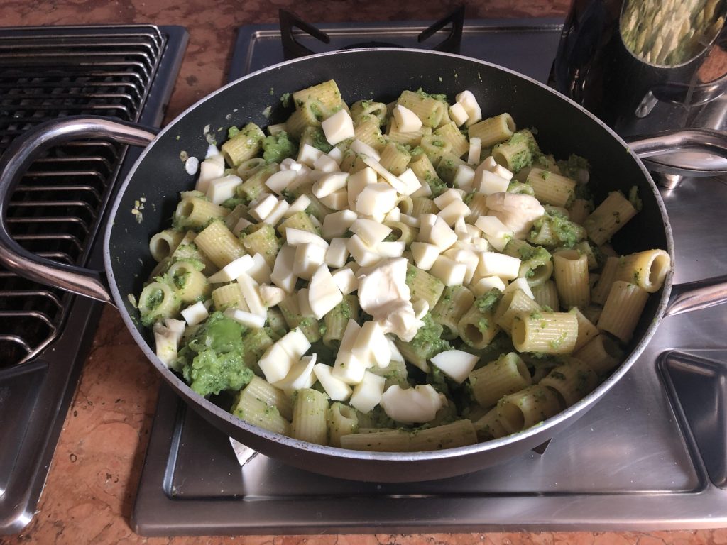 • Das Brokkoli-Kochwasser erneut zum Kochen bringen und die Mezze-Maniche darin garen. Mit einem Schaumlöffel al dente herausnehmen, direkt in die Pfanne zum Gemüse geben und gut vermengen.